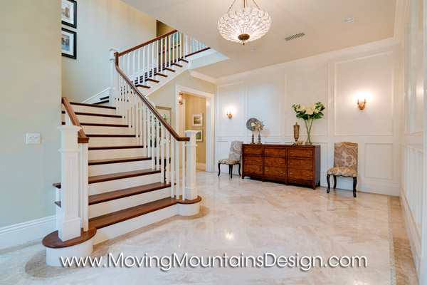 I love the gleaming walnut floors, limestone and painted wood paneling in the entry!