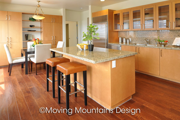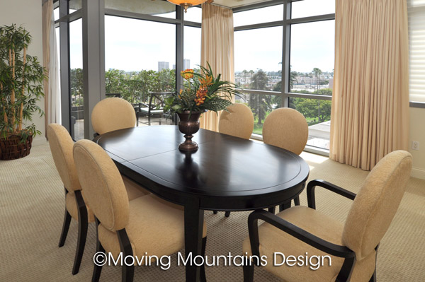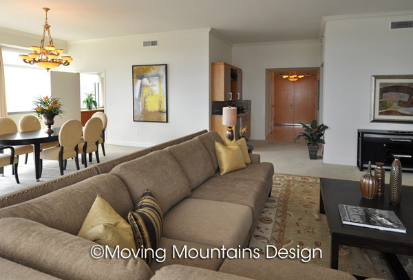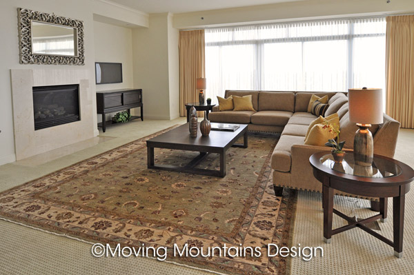 We also wanted to demonstrate an optimal furniture layout that takes advantage of the sweeping views, floor to ceiling windows and fireplace. As expert luxury home stagers, we used high quality furniture, artwork, home staging accessories and Persian rugs. With the simple, elegant architecture, we could have staged this home in either a contemporary, transitional or traditional style. After doing research on area and building demographics, I decided that transitional furniture would most likely appeal to potential buyers of this home.